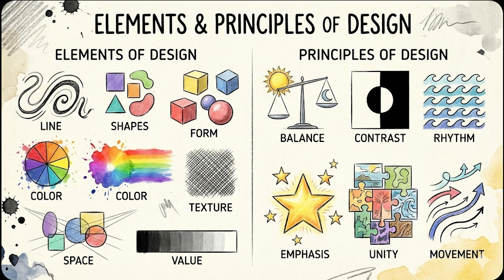 Elements and Principles of Design is a foundational course that introduces students to the essential building blocks used in all forms of visual art and design. Through hands-on activities and guided exploration, students learn how elements such as line, shape, color, texture, and space can be combined to create meaningful compositions. The course also emphasizes the principles of design—including balance, contrast, rhythm, unity, emphasis, and movement—and examines how these concepts influence the viewer’s experience. Students will develop the ability to analyze and critique visual work while applying these principles to their own creative projects. By the end of the course, learners will have a strong understanding of how thoughtful design decisions can communicate ideas, evoke emotions, and strengthen artistic expression.